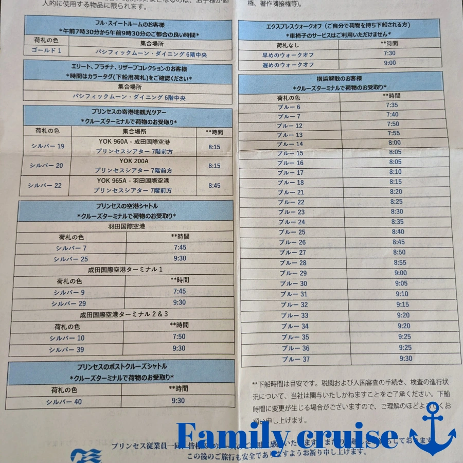 さらに観光ツアーに行く人や空港シャトルバスに乗る人、スイートの人は別に下船時間が設定されています。